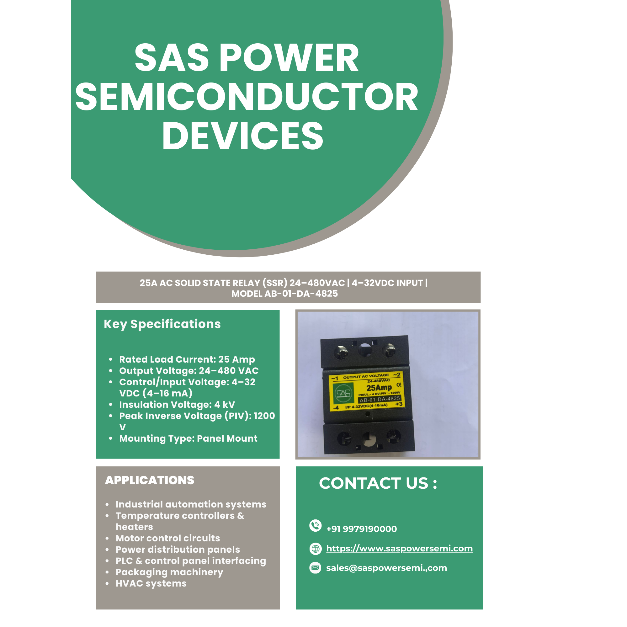 25A AC Solid State Relay (SSR) – 24–480VAC | 4–32VDC Input | Model AB-01-DA-4825 Product Overview The SAS 25A AC Solid State Relay (Model: AB-01-DA-4825) is a high-performance, panel-mount SSR designed for reliable switching of AC loads in industrial and automation applications. With a wide output voltage range of 24–480VAC and a low control input of 4–32VDC, this relay ensures efficient, noise-free, and long-life operation. Unlike electromechanical relays, this solid state relay offers fast switching, zero maintenance, silent operation, and superior durability, making it ideal for continuous-duty environments. Key Specifications Rated Load Current: 25 Amp Output Voltage: 24–480 VAC Control/Input Voltage: 4–32 VDC (4–16 mA) Insulation Voltage: 4 kV Peak Inverse Voltage (PIV): 1200 V Mounting Type: Panel Mount Model Number: AB-01-DA-4825 Certifications: CE Compliant Key Features ✔ Wide AC voltage handling up to 480VAC ✔ High current capacity of 25A ✔ Low power DC control signal ✔ Zero arcing & silent switching ✔ High dielectric strength (4kV insulation) ✔ Compact, rugged industrial design ✔ Long operational life with no mechanical wear Applications Industrial automation systems Temperature controllers & heaters Motor control circuits Power distribution panels PLC & control panel interfacing Packaging machinery HVAC systems Why Choose SAS Solid State Relays? SAS solid state relays are manufactured using high-quality power semiconductor components, ensuring stable performance, electrical safety, and long service life even in harsh industrial environments. Each unit is tested to meet international quality and reliability standards. Technical Advantage The DC-to-AC SSR configuration allows seamless integration with PLC outputs, microcontrollers, and automation control systems while safely switching high-voltage AC loads without electromagnetic interference (EMI). Ordering Information 📌 Model: AB-01-DA-4825 📌 Current Rating: 25A 📌 Output: AC 📌 Input: DC Contact us today for bulk pricing, datasheets, and custom requirements.