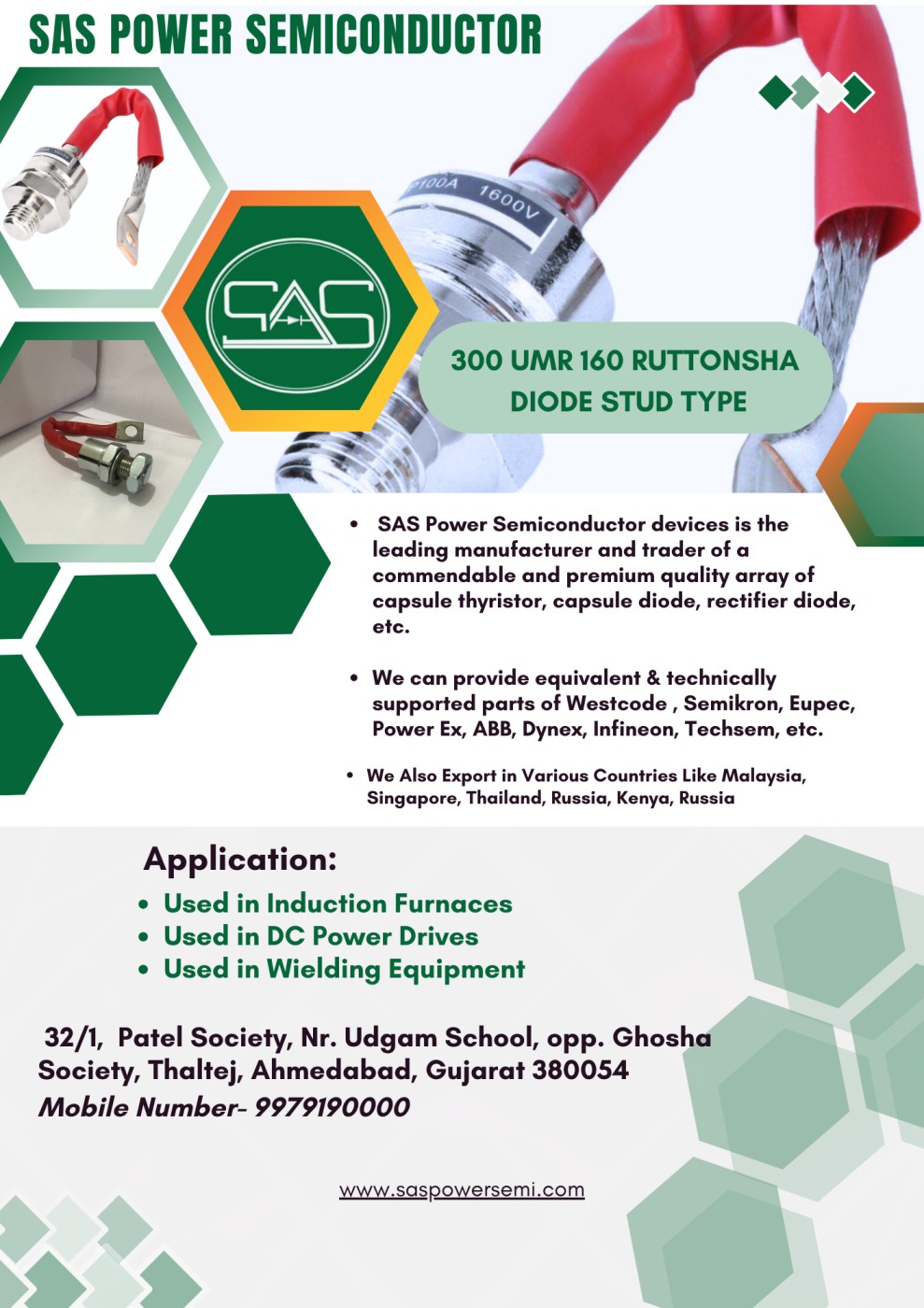 300 UMR 160 Ruttonsha Diode Stud Type SAS Power Semiconductor devices From India is the leading manufacturer and trader of a commendable and premium quality array of capsule thyristor, capsule diode, rectifier diode, etc. We can provide equivalent & technically supported parts of Westcode , Semikron, Eupec, Power Ex, ABB, Dynex, Infineon, Techsem, etc. We Also Export in Various Countries Like Malaysia, Singapore, Thailand, Russia, Kenya, Russia Used in Induction Furnaces Used in DC Power Drives Used in Wielding Equipment