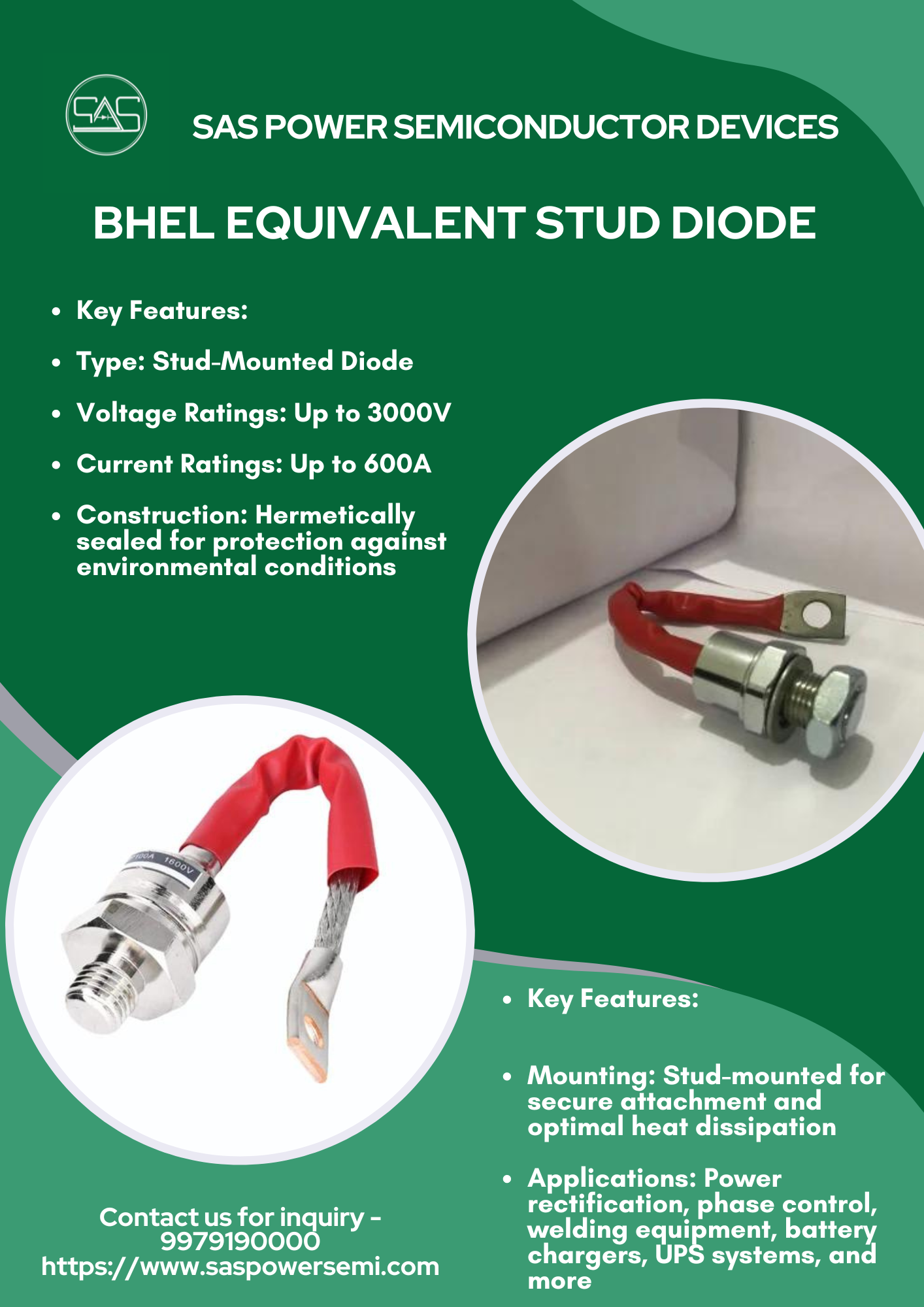 BHEL Equivalent Stud Diode Product Description Our BHEL equivalent stud diodes are designed to deliver reliable performance in various industrial applications, offering superior power handling capabilities and durability. These diodes are engineered to meet high-quality standards, making them an ideal replacement for BHEL stud diodes in power electronics systems. Key Features: 1. Type: Stud-Mounted Diode 2. Voltage Ratings: Up to 3000V 3. Current Ratings: Up to 600A 4. Construction: Hermetically sealed for protection against environmental conditions 5. Mounting: Stud-mounted for secure attachment and optimal heat dissipation 6. Applications: Power rectification, phase control, welding equipment, battery chargers, UPS systems, and more Compliances: Conforms to [mention any relevant international or Indian standards] Applications: 1.Industrial power supplies 2.Motor drives 3.Welding equipment 4.High-voltage rectifiers 5.Battery chargers and inverters Product Benefits: 1.High surge current capacity 2.Long operational life 3.Reliable performance in harsh environments Efficient heat dissipation 4.Customizable Options: We offer customization options for voltage, current ratings, and packaging to meet your specific application needs. Why Choose Us? 1.Competitive pricing 2.Global sourcing of components 3.Fast delivery times 4.Technical support and after-sales service Contact Us for Pricing and Further Details