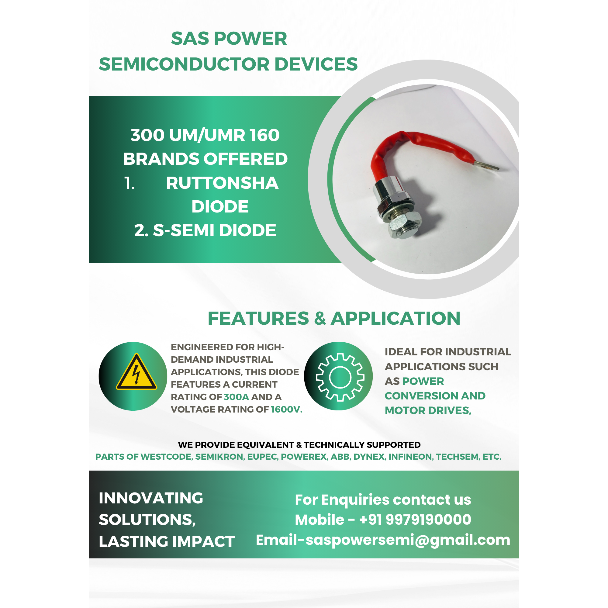 Leading Manufacturer & Supplier of High-Quality Stud Type Rectifier Diodes – SAS Power Semiconductor Devices** At **SAS Power Semiconductor Devices**, we are proud to be recognized as a **trusted manufacturer and trader** of premium-quality **semiconductor power devices**. As a **sole proprietorship** company, we specialize in delivering a wide range of **rectifier diodes, capsule thyristors, and power modules** engineered for reliability and performance across industrial applications. We offer a comprehensive selection of **stud type rectifier diodes** in various specifications to meet the diverse needs of our clients. Our products are known for their durability, efficiency, and compatibility with top international brands such as **Westcode, Semikron, Eupec, Powerex, ABB, Dynex, Infineon, Techsem**, and more. We also provide equivalent and technically-supported alternatives for these global brands. ### Our Stud Type Rectifier Diode Range Includes: * **12 FM/FMR 120-160** * **16 FM/FMR 120-160** * **25 F/FR 120-160** * **25 HM/HMR 120-160** * **40 HM/HMR 120-160** * **40 HF/HFR 120-160** * **70 HM/HMR 120-160** * **70 HF/HFR 120-160** * **85 HF/HFR 120-160** * **100 LM/LMR 120-160** * **150 LM/LMR 120-160** * **150 LF/LFR 40-160 (Flat/Round)** * **200 LM/LMR 120-160** * **300 UM/UMR 120-160** * **321 UM/UMR 120-180** * **450 UM/UMR 120-180** * **300 UF/UFR 40-16 (Flat/Round)** * **450 UF/UFR 40-16 (Flat/Round)** * **D61-300-32R/N** * **SKR 240/16E and SKN 240/16E** All our **semiconductor rectifier diodes** are manufactured using advanced technology and tested for quality and performance. Whether you're looking for **industrial-grade diodes**, **replacement equivalents**, or **custom specifications**, we have the capability to deliver with **short lead times and competitive pricing**. > **Note:** Prices are subject to change based on market fluctuations. For the best quote, please contact our sales team directly.