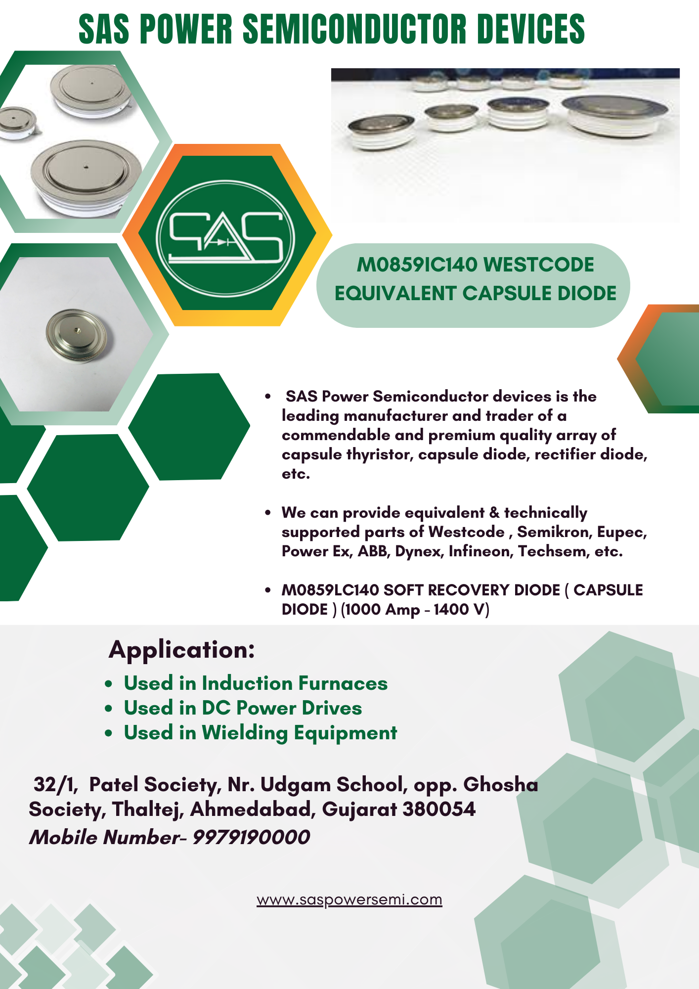 M0859LC140 SOFT RECOVERY DIODE ( CAPSULE DIODE ) (1000 Amp - 1400 V) 1. Introducing the M0859LC140 Soft Recovery Diode Capsule Type offered by SAS Power Semiconductor Devices, is a high-performance component ideal for controlling power in industrial applications. 2. With a current rating of 1000A and a voltage rating of 1400V, this thyristor is engineered for reliability and efficiency. 3. It features robust construction, ensuring durability in demanding environments. 4. The M0859LC140 is designed for seamless integration into power control systems, providing precise control and improved performance. 5. SAS Power Semiconductor Devices guarantees top quality and excellent service, making it a trusted choice for your power semiconductor needs. We "SAS Power Semiconductor Devices" are the leading manufacturer and trader of a commendable and premium quality array of capsule thyristor, capsule diode, rectifier diode, etc. We are a sole proprietorship company and manufacture the high-quality range of products in varied specifications to fulfill the diverse needs of our clients. We can also provide equivalent & technically supported parts of Westcode, Semikron, Eupec, Powerex, ABB, Dynex, Infineon, Techsem, etc. All variants of M0859LC140 are available. RECTIFIER FAST RECOVERY DIODE M0859LC140 RECTIFIER FAST RECOVERY DIODE M1494LC200 RECTIFIER FAST RECOVERY DIODE M1022LC200 Price May Varies As Per Market Situation