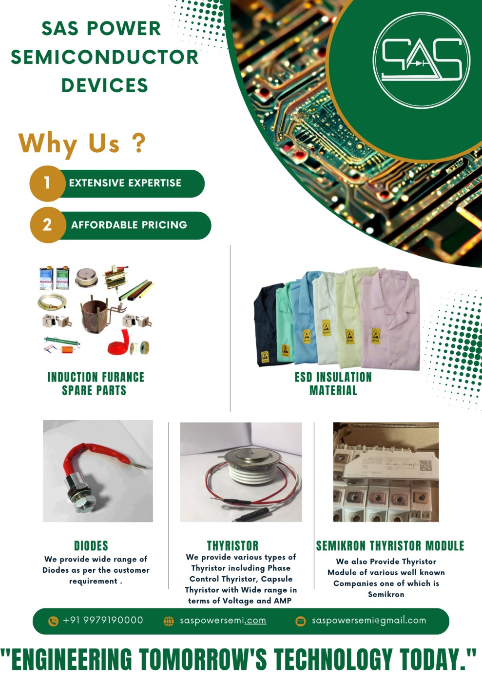 New Product Additions at SAS Power Semiconductor SAS Power Semiconductor is excited to expand our product portfolio with two new categories: Induction Furnace Spare Parts and ESD Insulation Materials. With our commitment to quality and technological innovation, these additions cater to the evolving needs of the industry, offering reliable solutions to enhance performance, safety, and efficiency. Discover more about our new products below: Induction Furnace Spare Parts Induction furnaces are critical in metal processing industries, where performance and durability directly impact productivity. Our new line of Induction Furnace Spare Parts ensures seamless operation and minimal downtime, thanks to the premium quality components and materials used. These spare parts are designed to fit various furnace models and are manufactured under strict quality standards to deliver long-lasting reliability. Our product range includes: 1. Induction Coils: High-quality, durable coils engineered to withstand extreme temperatures and deliver efficient heating. 2. Water-Cooled Cables: Designed for maximum thermal performance and flexible installation, our water-cooled cables ensure the optimal functioning of your induction furnace. 3. Crucibles and Linings: Premium-grade crucibles and linings provide excellent resistance to thermal shock and mechanical stress, extending the life of your furnace. 4.Capacitors and Chokes: Essential for regulating power, our capacitors and chokes maintain the smooth operation of induction systems. 5. Other Replacement Parts: Including electrodes, magnetic yokes, and thermal sensors, ensuring your furnace operates at peak efficiency. Upgrade your induction furnace with our high-quality spare parts that promise enhanced productivity and reduced maintenance costs. ESD Insulation Materials Safety and precision are vital in semiconductor manufacturing, and protecting sensitive electronic components from electrostatic discharge (ESD) is crucial. Our new range of ESD Insulation Materials is designed to provide robust protection and insulation, ensuring a safe working environment and compliance with industry standards. Available products include: 1. ESD Caps and Aprons: Made from static-dissipative materials, our caps and aprons prevent electrostatic buildup and safeguard sensitive components during handling and assembly. 2. ESD Mats: Featuring high-quality insulation properties, our mats effectively dissipate static charges, providing a secure workstation surface for handling electronic devices. Available in various sizes and thicknesses for different applications. 4. ESD Gloves and Footwear Covers: Ensure comprehensive protection against ESD with our range of gloves and footwear covers, enhancing safety in the workplace. 5. Customized ESD Solutions: We also offer tailored ESD protection solutions to meet the unique requirements of your facility. By incorporating our ESD insulation materials, you not only protect your workforce but also extend the life of your electronic equipment and ensure compliance with safety standards. Why Choose SAS Power Semiconductor? With over 45 years of industry expertise, SAS Power Semiconductor stands out for providing high-quality products that meet stringent standards. Our new additions of Induction Furnace Spare Parts and ESD Insulation Materials complement our existing product lineup, delivering comprehensive solutions that address the needs of modern manufacturing environments. Key benefits of choosing our products: 1.Superior Quality: We source top-grade materials and adhere to strict quality control processes. 2. Competitive Pricing: Get premium products at competitive rates, backed by exceptional customer support. 3. Customized Solutions: Tailor our products to your specific requirements, ensuring optimal performance. 4.Global Reach: With a strong network of suppliers and partners, we can deliver our products worldwide. Discover how SAS Power Semiconductor’s new offerings can help elevate your operations. Contact us today to learn more or request a quote