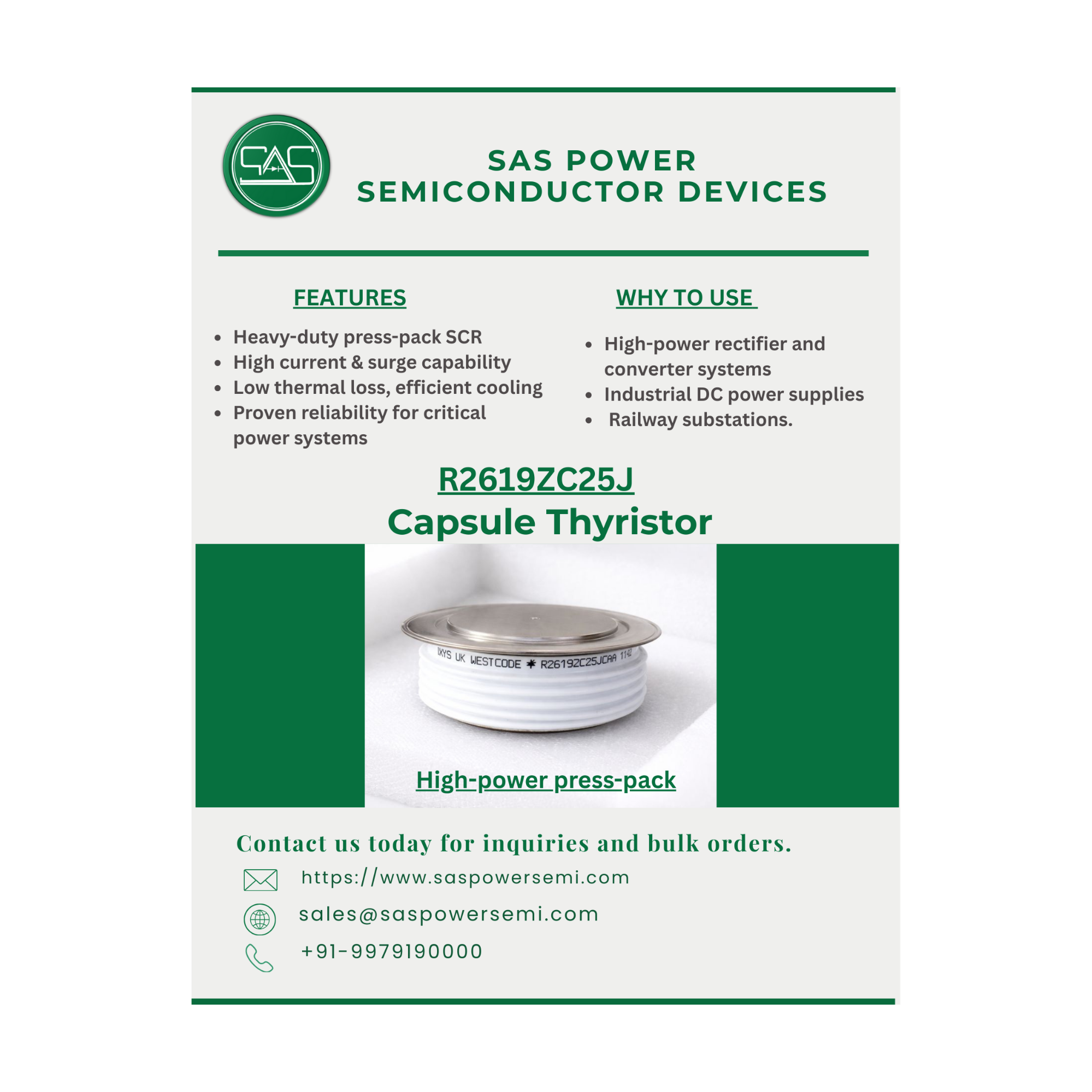 SAS Power Semiconductor Devices proudly offers the R2619ZC25J Capsule Thyristor, a high-performance press-pack SCR engineered for demanding power conversion and rectification applications. Designed to deliver exceptional current handling, surge endurance, and thermal efficiency, this device is ideal for mission-critical power systems where reliability is non-negotiable. Product Overview The R2619ZC25J is a heavy-duty capsule thyristor built to operate under extreme electrical and thermal stress. Its robust press-pack construction ensures uniform current distribution, efficient heat dissipation, and long operational life, making it a preferred choice for high-power industrial environments. Key Features Heavy-duty press-pack SCR design High current and surge capability Low thermal loss with efficient cooling Excellent mechanical strength and electrical stability Proven reliability in critical power systems Suitable for continuous high-load operation Applications The R2619ZC25J Capsule Thyristor is widely used in: High-power rectifier and converter systems Industrial DC power supplies Railway traction and substations Electrochemical processes Steel plants, cement plants, and heavy industries Power control and energy conversion systems Why Choose SAS Power Semiconductor Devices? With over 45 years of experience in semiconductor manufacturing, SAS Power Semiconductor Devices is recognized for delivering genuine, high-quality power semiconductor solutions at competitive prices. Our products are manufactured and sourced under strict quality standards, ensuring consistent performance, durability, and long-term reliability. Technical Support & Custom Requirements Our experienced technical team assists customers with: Product selection Application compatibility Bulk and project-based requirements Customized solutions for industrial power systems Contact Us for Bulk Orders & Enquiries 📧 Email: sales@saspowersemi.com 🌐 Website: https://www.saspowersemi.com 📞 Phone: +91-9979190000