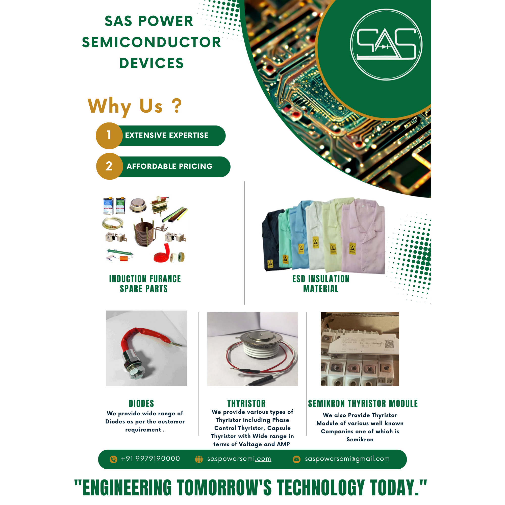 At SAS Power Semiconductor Devices, we specialize in providing high-performance semiconductors and industrial solutions tailored to your needs. With extensive expertise and a strong reputation for affordable pricing, we are a reliable partner for industries that demand quality and durability. 🔋 Wide Range of Semiconductor Products 1. Thyristors We supply various types of thyristors, including Phase Control Thyristors and Capsule Thyristors, with a wide range of voltage and AMP ratings to meet diverse industrial requirements. 2. Diodes Our portfolio includes a comprehensive range of diodes designed for efficiency and long-term performance, customizable as per customer requirements. 3. Semikron Thyristor Modules We provide original Semikron thyristor modules, trusted worldwide for superior reliability in demanding industrial environments. 🏭 Industrial Spare Parts & ESD Protection Induction Furnace Spare Parts – High-quality spare parts to ensure seamless furnace operation. ESD Insulation Material – Lab coats and materials to protect sensitive equipment from electrostatic damage. 🌍 Why Choose SAS Power Semiconductor Devices? ✔️ Extensive Expertise – Backed by years of experience in power electronics. ✔️ Affordable Pricing – Quality components at competitive rates. ✔️ Global Reach – Serving customers across India and international markets. 📞 Get in Touch 👉 Call us at +91 9979190000 👉 Visit us: saspowersemi.com 👉 Email: saspowersemi@gmail.com