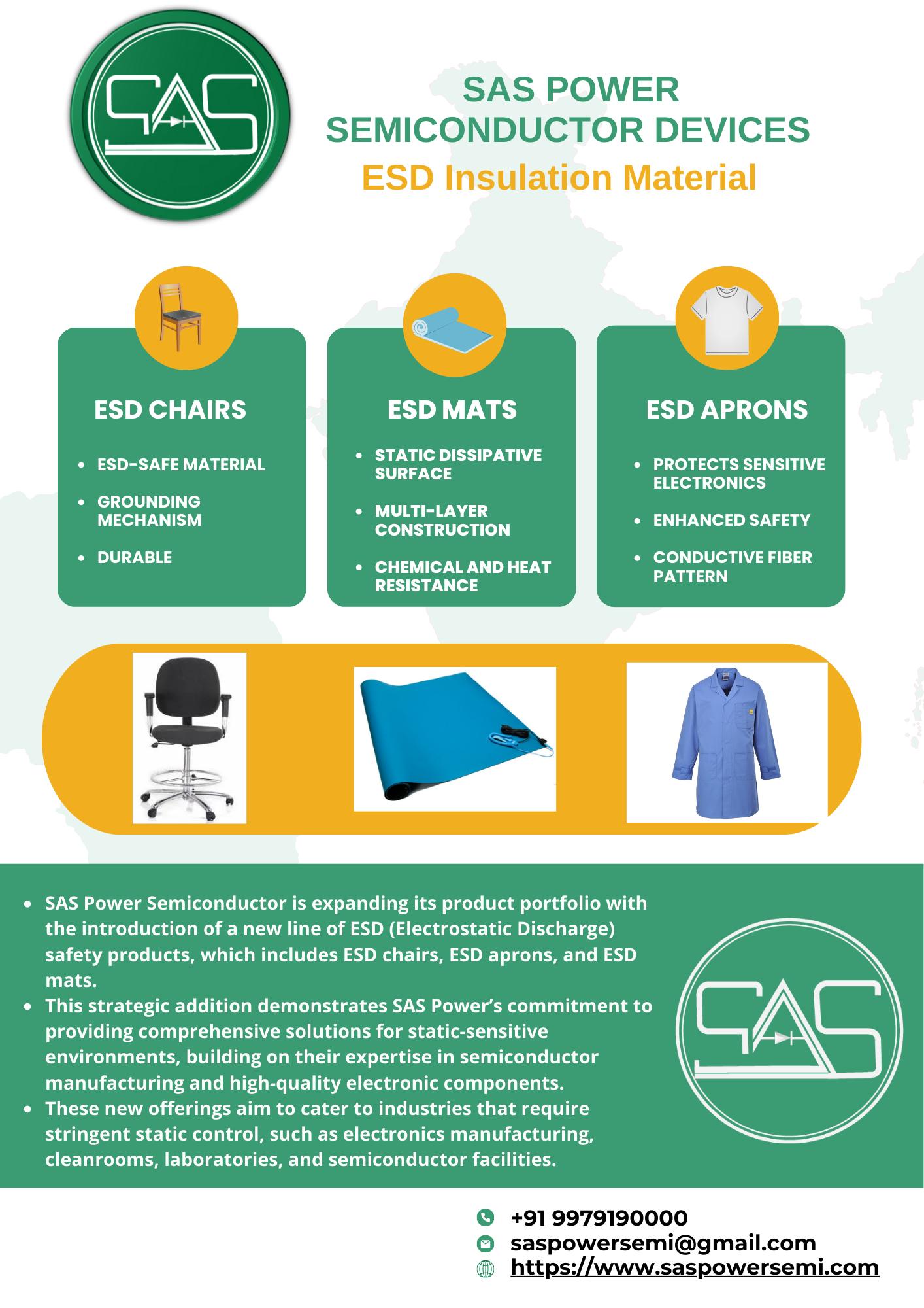 SAS Power Semiconductor is expanding its product portfolio with the introduction of a new line of ESD (Electrostatic Discharge) safety products, which includes ESD chairs, ESD aprons, and ESD mats. This strategic addition demonstrates SAS Power’s commitment to providing comprehensive solutions for static-sensitive environments, building on their expertise in semiconductor manufacturing and high-quality electronic components. These new offerings aim to cater to industries that require stringent static control, such as electronics manufacturing, cleanrooms, laboratories, and semiconductor facilities. ESD Chairs The ESD chairs offered by SAS Power are designed with cutting-edge static-dissipative materials and grounding mechanisms, making them ideal for environments where static electricity must be controlled to protect sensitive electronic equipment. The chairs feature a conductive base and ESD-safe casters or glides that ensure proper grounding, effectively minimizing the risk of electrostatic discharge. Additionally, they come with ergonomic adjustments for height, tilt, and lumbar support, providing comfort for long work hours without compromising ESD safety. Built with durable materials, these chairs align with SAS Power’s commitment to quality, ensuring reliability and long-term performance in industrial settings. ESD Aprons SAS Power’s ESD aprons are tailored for personnel working in static-sensitive environments, offering advanced protection against electrostatic discharge. These aprons are crafted from lightweight, static-dissipative fabric with woven conductive fibers that disperse static charges, preventing build-up on the wearer's clothing. Designed for comfort and ease of movement, they come with adjustable straps and durable construction that can withstand frequent washing without compromising their ESD properties. By adhering to international standards for ESD protection, such as ANSI/ESD S20.20, these aprons ensure workers’ safety while enhancing the overall static control within facilities. ESD Mats The newly introduced ESD mats by SAS Power are suitable for both workstations and floor areas, providing a safe and controlled environment for handling sensitive electronic components. Made from high-quality, static-dissipative rubber or vinyl, these mats are engineered to discharge static electricity gradually, safeguarding both personnel and equipment. With grounding cords and integrated snaps, the mats offer reliable grounding options and are built to resist chemical spills, soldering heat, and abrasion, ensuring durability in challenging conditions. Available in a variety of sizes and thicknesses, these mats cater to diverse industrial requirements and help maintain an ESD-compliant workspace. Strategic Benefits and Market Impact By adding ESD chairs, aprons, and mats to its product lineup, SAS Power Semiconductor is enhancing its value proposition to customers in the semiconductor and electronics industries. This expansion allows SAS Power to provide end-to-end ESD solutions that ensure safety, enhance productivity, and maintain product integrity. The move is expected to strengthen SAS Power’s position in the ESD protection market while supporting its vision of becoming a global leader in high-quality, sustainable, and comprehensive semiconductor solutions. With these innovative ESD products, SAS Power Semiconductor is not only addressing the growing demand for static control in high-tech environments but also reinforcing its reputation for excellence, quality, and dedication to safety and technological advancement.
