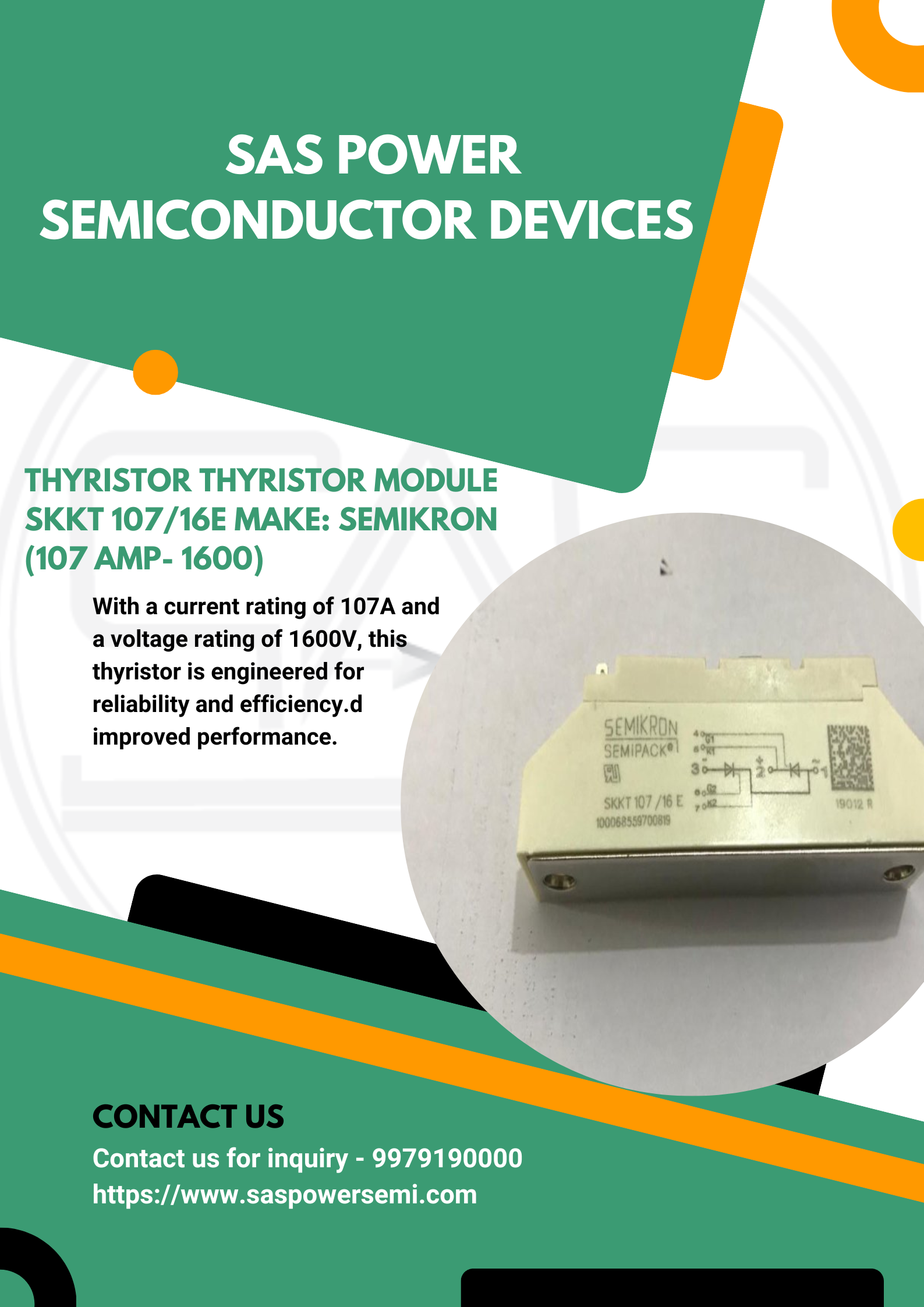 THYRISTOR THYRISTOR MODULE SKKT 107/16E MAKE: SEMIKRON (107 Amp- 1600 V) 1. The SKKT 107/16E SEMIKRON MODULE, offered by SAS Power Semiconductor Devices, is a high-performance component ideal for controlling power in industrial applications. 2. With a current rating of 107A and a voltage rating of 1600V, this thyristor is engineered for reliability and efficiency. 3. It features robust construction, ensuring durability in demanding environments. 4. The SKKT 107/16E is designed for seamless integration into power control systems, providing precise control and improved performance. 5. SAS Power Semiconductor Devices guarantees top quality and excellent service, making it a trusted choice for your power semiconductor needs. We "SAS Power Semiconductor Devices" are the leading manufacturer and trader of a commendable and premium quality array of capsule thyristor, capsule diode, rectifier diode, etc. We can also provide equivalent & technically supported parts of Westcode, Semikron, Eupec, Powerex, ABB, Dynex, Infineon, Techsem, etc. All variants of SKKT 107/16E are available and also SSKT 107B 16E.