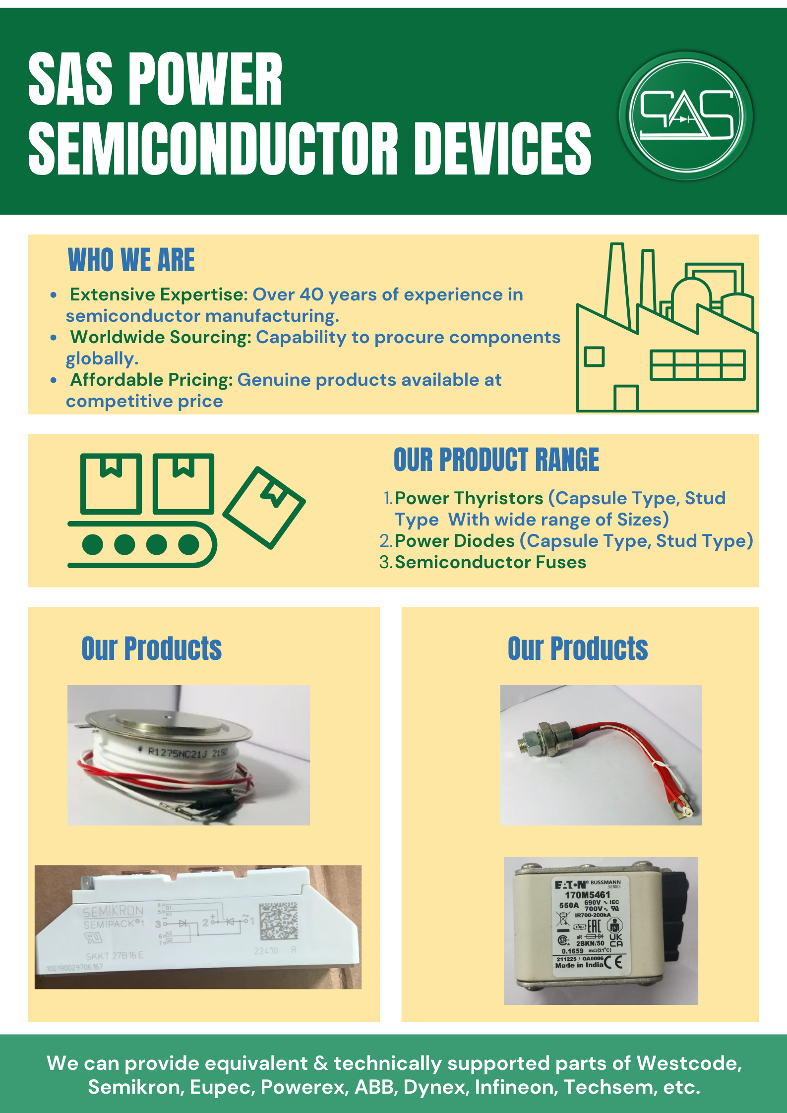 Welcome to SAS Power Semiconductor Devices Empowering Innovation. Delivering Excellence. With over 40 years of expertise in semiconductor manufacturing, SAS Power is a trusted leader in delivering high-quality power semiconductor solutions to industries worldwide. Our extensive experience, global sourcing capabilities, and affordable pricing make us the preferred partner for power electronic components. Who We Are Extensive Expertise: Backed by four decades of experience in semiconductor design and manufacturing. Global Sourcing: We have the capability to procure genuine components from around the world. Affordable Pricing: Our products are available at competitive prices without compromising quality. Our Product Range ✅ Power Thyristors (Capsule Type, Stud Type) – Available in a wide range of sizes ✅ Power Diodes (Capsule Type, Stud Type) ✅ Semiconductor Fuses We offer technically supported and equivalent products for brands like Westcode, Semikron, Eupec, Powerex, ABB, Dynex, Infineon, Techsem, and more. Why Choose SAS Power? 🔹 Reliable & Genuine Products 🔹 Wide Product Selection 🔹 Competitive Pricing 🔹 Technical Expertise 🔹 Global Delivery Our Products Power Thyristors & Diodes Rectifier Diodes Semiconductor Fuses Custom Power Modules Partner with us for high-performance, cost-effective semiconductor solutions trusted by global industries. 📞 Get in Touch Email: saspowersemi@gmail.com Phone: +91- 9979190000 Website: https://www.saspowersemi.com/