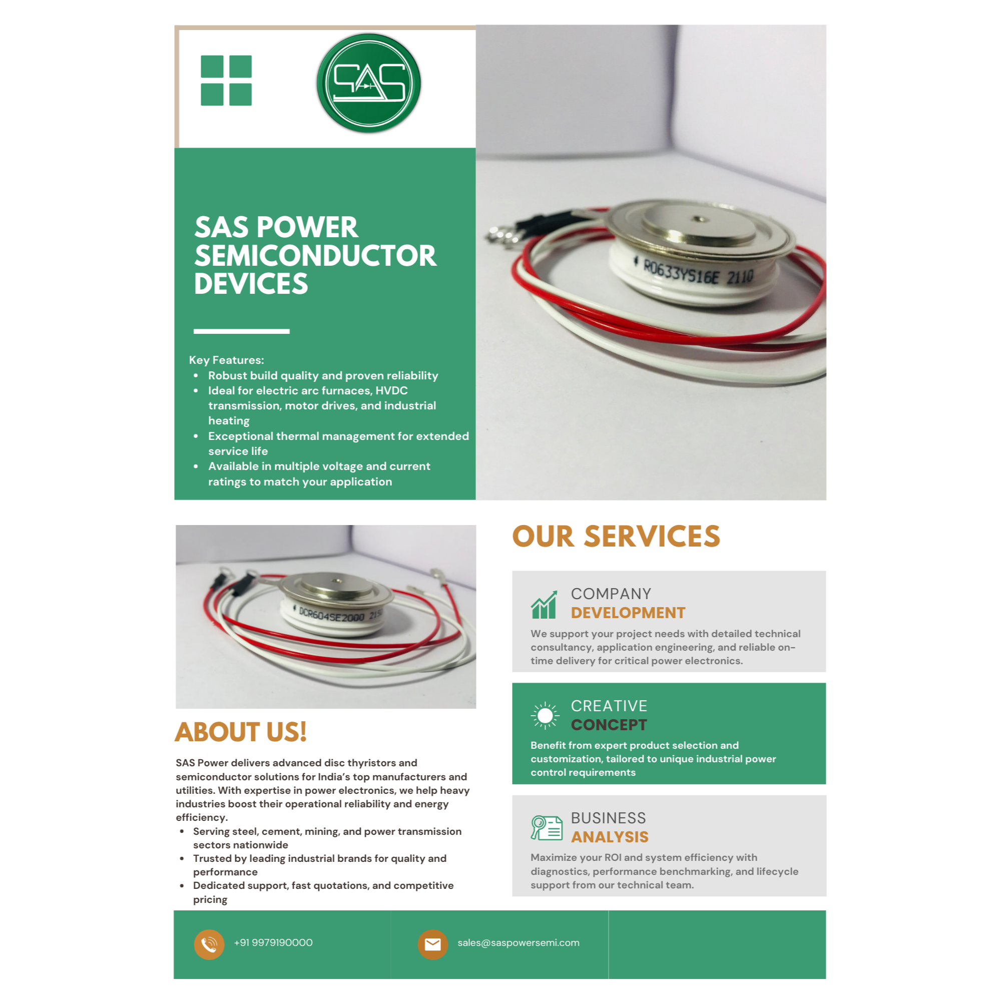 India’s Leading Disc Thyristor Supplier SAS Power delivers high-performance disc thyristors and power semiconductor devices, renowned for robust build quality, enhanced reliability, and industry-best operational life. Our products are engineered for electric arc furnaces, HVDC transmission, motor drives, and industrial heating applications, supporting critical needs in steel, cement, mining, and utility sectors nationwide. Key Features & Benefits Proven reliability with rigorous testing and premium build quality Exceptional thermal management for extended service life Multiple voltage and current ratings for tailored solutions Ideal for heavy industry: steel, mining, cement, and power transmission Fast quotations, dedicated technical support, and competitive pricing Expertise & Services At SAS Power, our expert engineers offer technical consultancy, custom product selection, and complete lifecycle analysis to maximize your system ROI. We partner with leading industrial brands to ensure premium quality and seamless integration with existing operations. Benefit from local support and fast, reliable delivery across India. Why Choose SAS Power? Trusted by top manufacturers and utilities across India Industry-leading quality assurance and post-sales support Specialist experience for demanding power control and automation projects Contact Our Team Boost your power system’s efficiency and reliability with SAS Power disc thyristors. Speak to our experts for fast quotations, technical advice, and product recommendations tailored to your industrial requirements